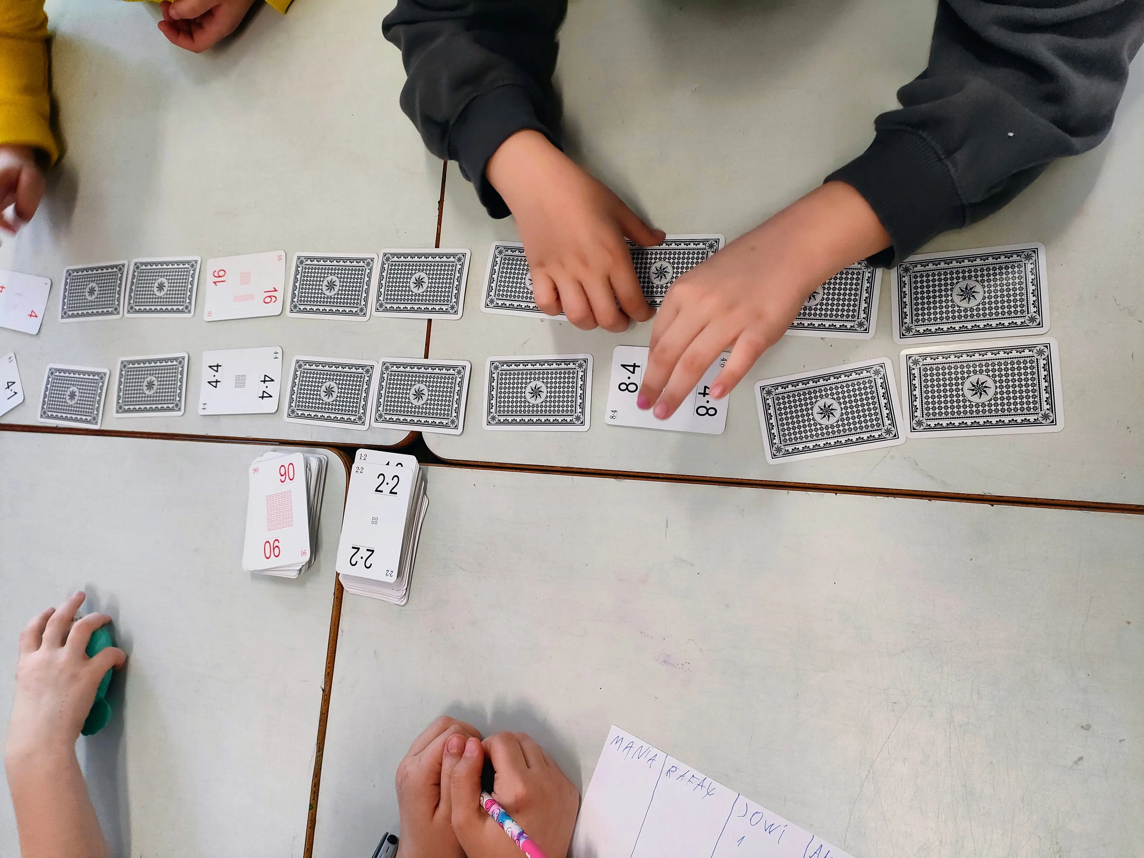Jednym z wariantów, który szczególnie lubię na początku drogi z Kartami, jest gra „Kopciuszek”. Uczniowie segregują Karty, dobierając działania w pary, i porządkują je według określonej zasady. Już samo przygotowanie gry wymaga przejrzenia całego zakresu tabliczki mnożenia.