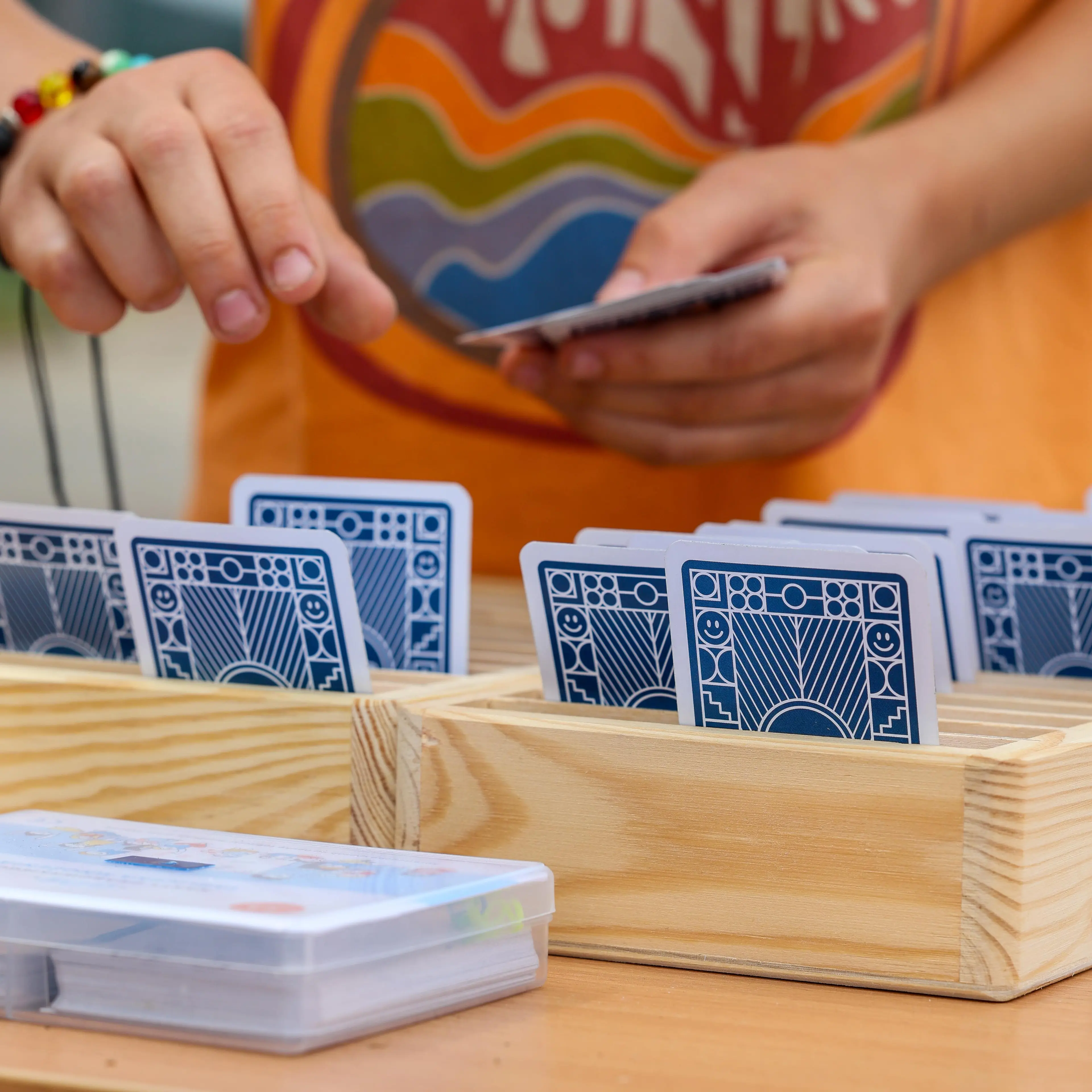 Drewniane pudełka do emocjonującej gry Olimpijczycy, którą rozgrywa się z wykorzystaniem Kart Grabowskiego Tabliczka mnożenia.